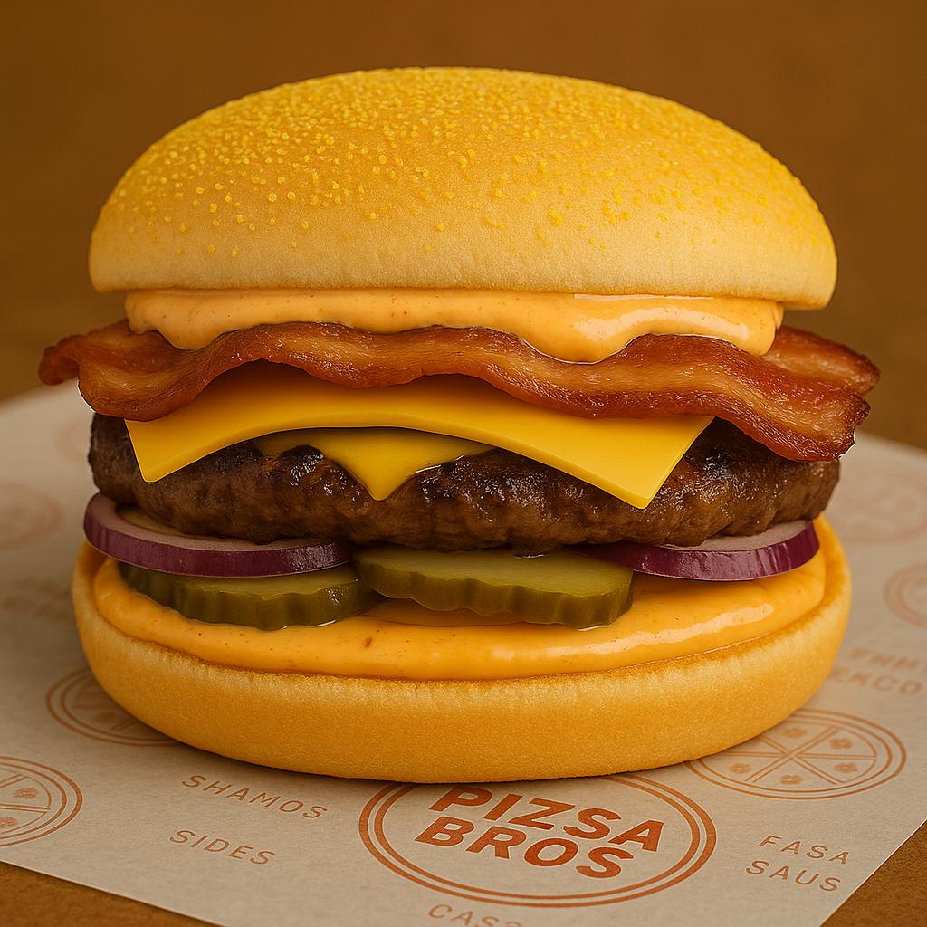 Corn dusted buns with, mayo, BBQ, lettuce, onion, cheese, bacon and thick angus beef patty